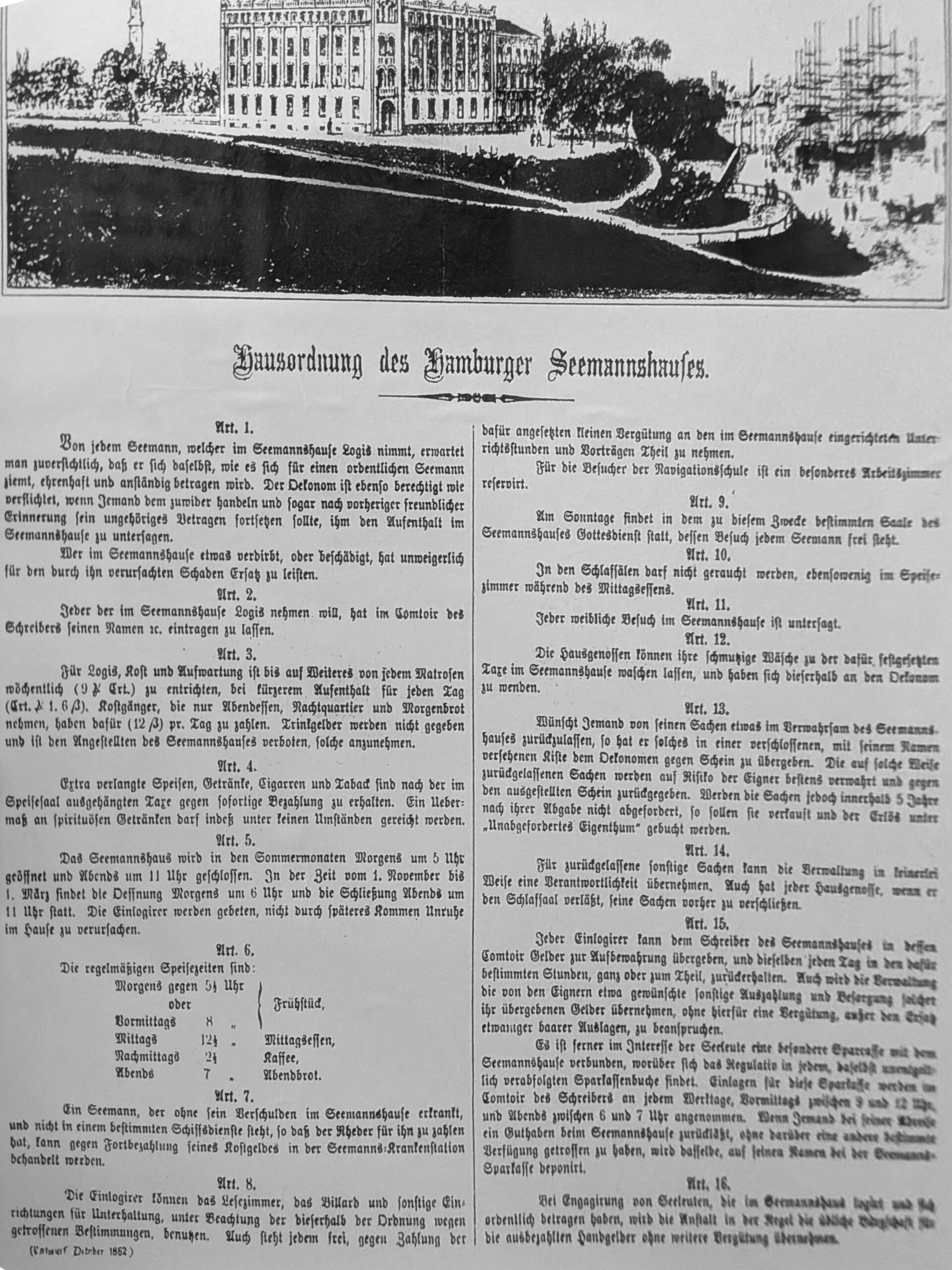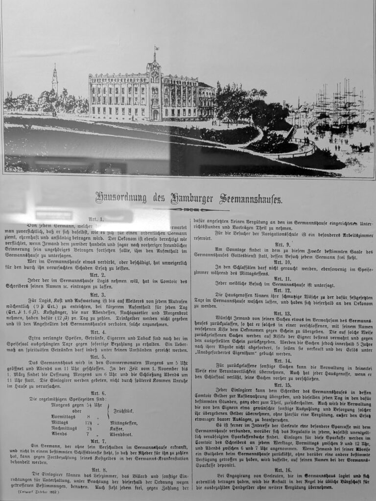 Ich war im Hotel Hafen Hamburg und habe diese „ Alte Kostbarkeit“ entdeckt. Früher war das Hotel ein Seemannsheim, welches sehr stark frequentiert wurde. In den Jahren 1856/1858 wurde es von Hamburger Reedern als Seemannsheim mit Krankenstation errichtet. Zeitweilig war dort auch der Heuerstall und die Navigationsschule. Während der Weltkriege wurde das Haus von der Marine als Ausbildungsstätte benutzt und nach Kriegsende von der britischen Royal Navy beschlagnahmt. 1979 wurde es ein Hotel, welches einige maritime Kostbarkeiten verbirgt.