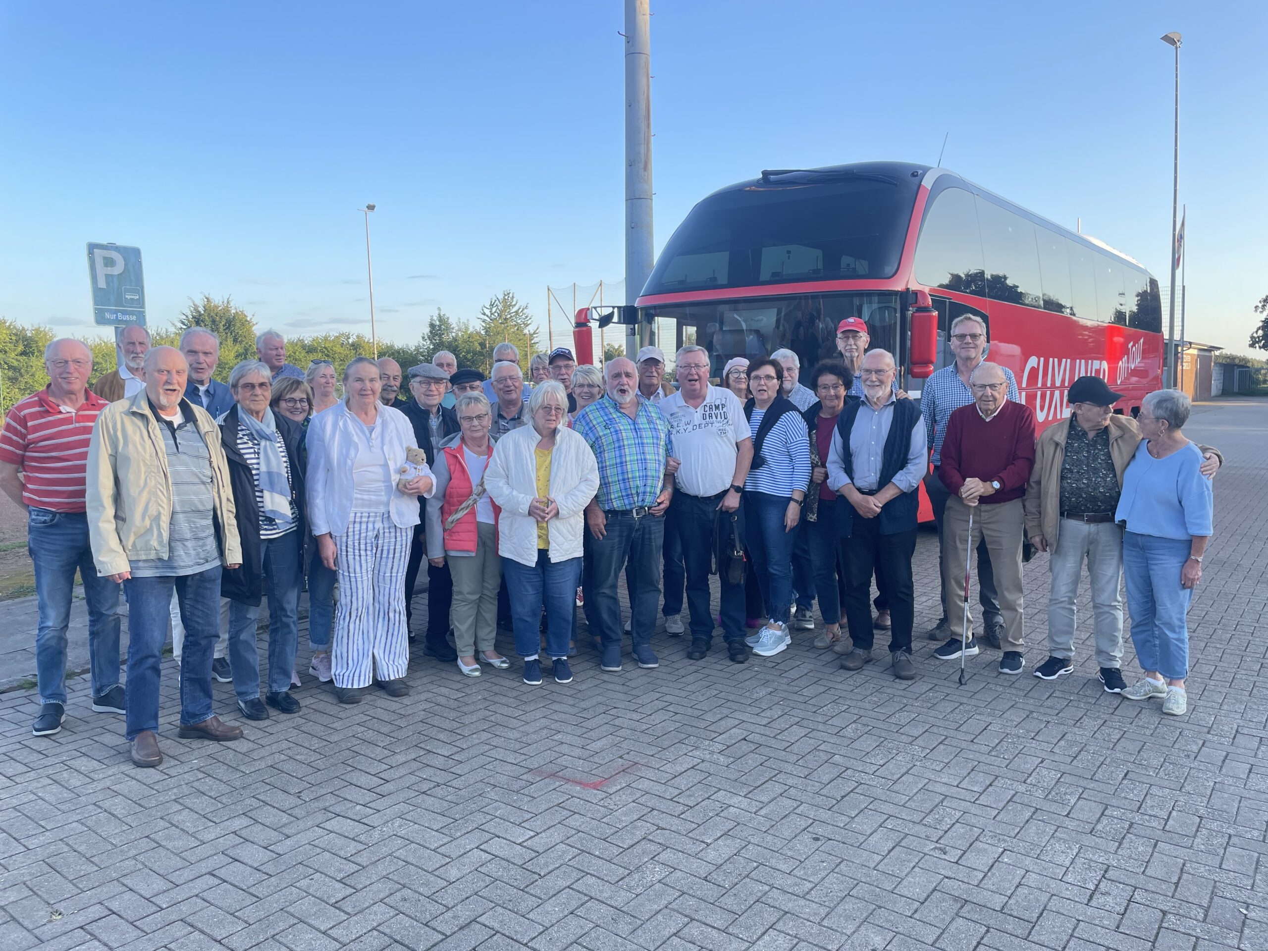 Die Reisegruppe vor dem roten Bus auf der Rückfahrt