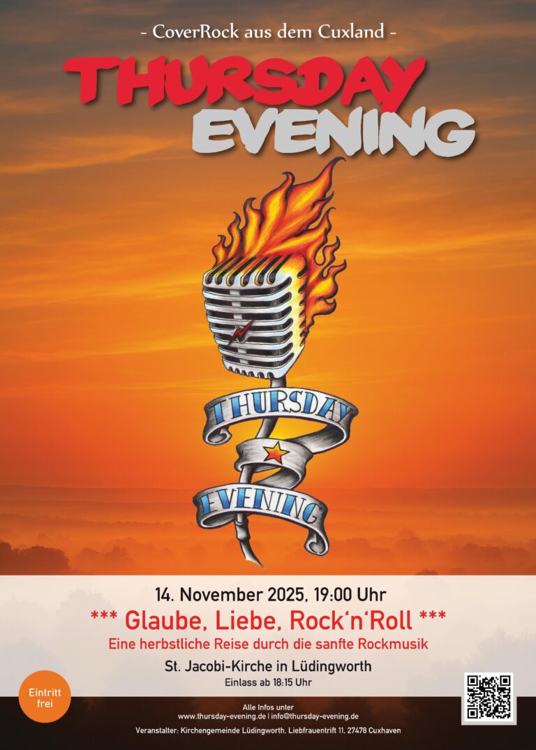 Mit der Coverband Thursday Evening kommen alle (Alt)Rocker auf Ihre Kosten. Am Freitag, den 14. November 2025 verspricht die Band mit eigenen Akzenten, und immer hart am Original vorbei, einen rockigen Abend in der St. Jacobi Kirche in Lüdingworth. Der Einlass ist ab 18:15 Uhr, der Eintritt ist frei. Infos über die Band gibt es hier.